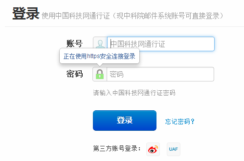 中国科技云通行证所有登录界面,对于是否正在受到https安全连接保护均给予明确提示。如下图中图标